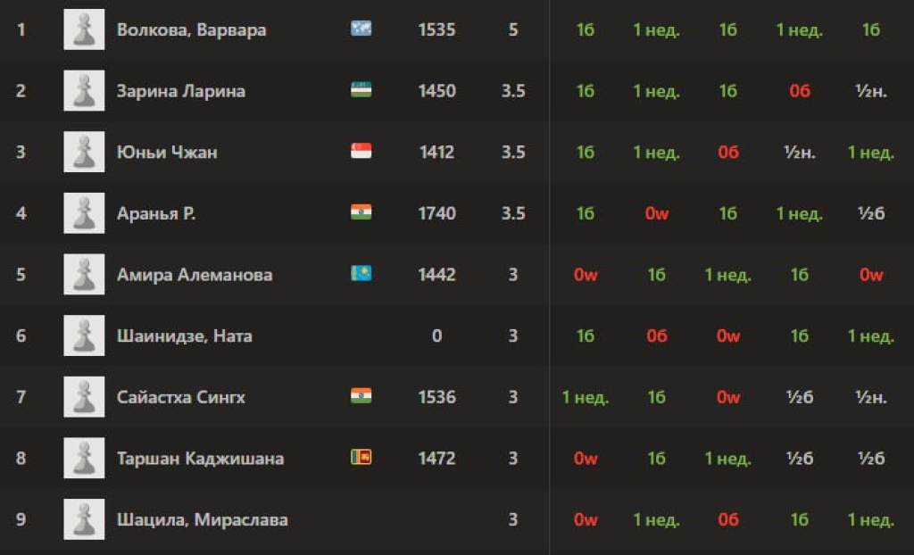Мазкур ёш тоифасида 20 нафар иштирокчи ғолиблик учун кураш олиб бораётган бўлса, 6-тур учрашувлари остонасида Халқаро шахмат федерацияси байроғи остида мусобақада қатнашаётган россиялик Варвара Волкова 5 та турдан кейин 5 очко жамғариб, якка пешқадамга айланган.