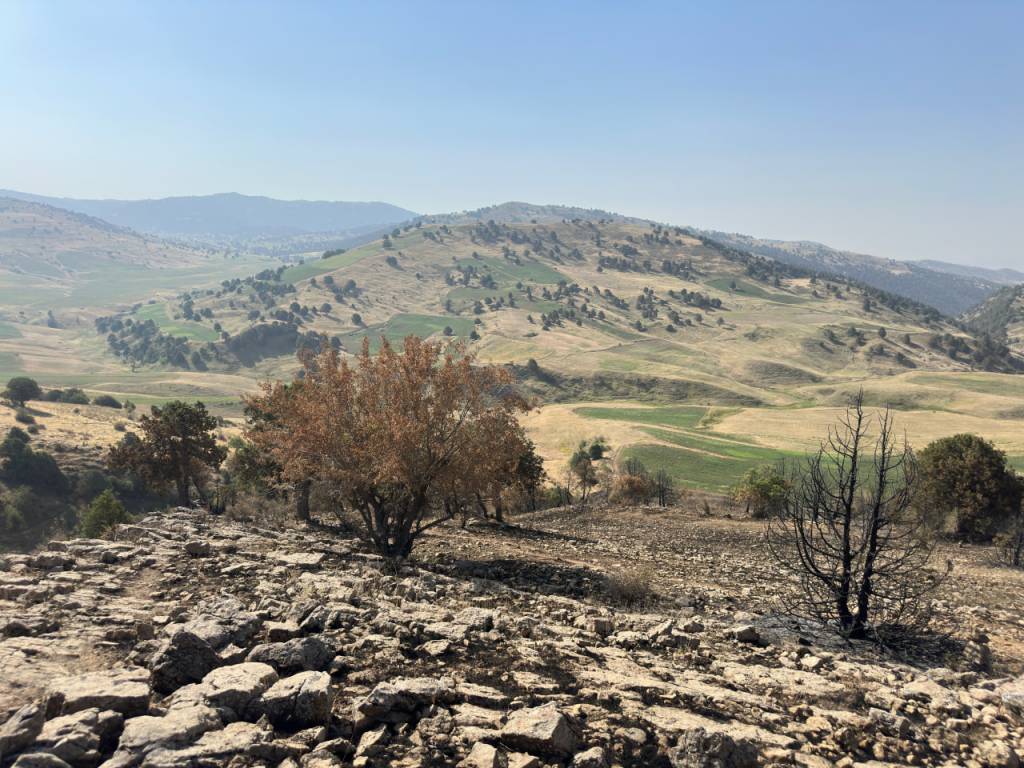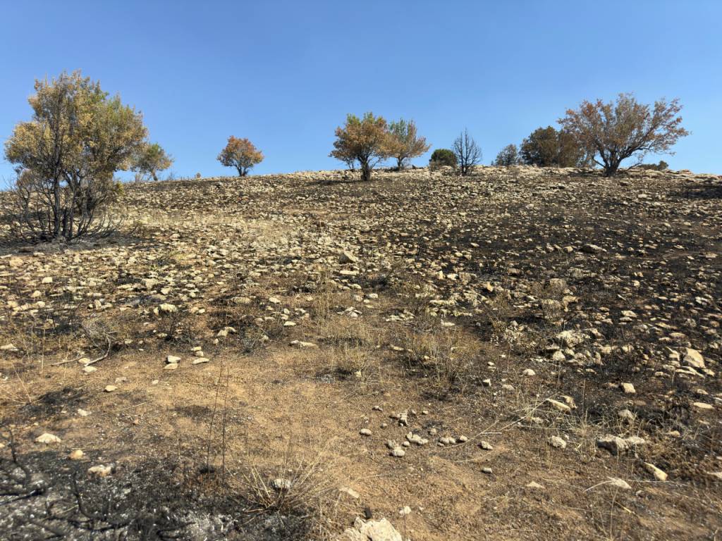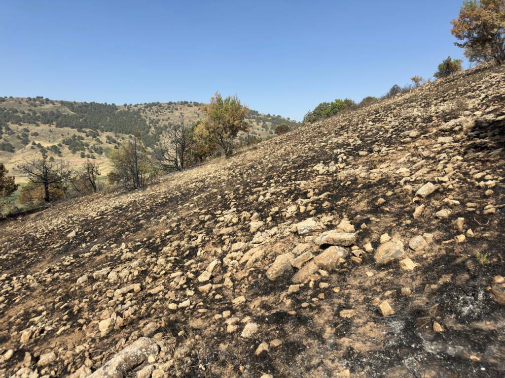 Олис ва машаққатли тоғ йўлидан манзилга етиб келдик. Мурожаатчи Файзиддин Хушвақтов бизга йўл кўрсатиб борди. Ҳақиқатда ёнғин у ердаги кўплаб ўсимлик дунёсига жиддий зарар етказган ва каттагина ҳудудни қоплаган. Бир қарашда у ердаги манзара ўлим водийсини эслатади. Файзиддин аканинг айтишича, энг ёмони ёниб кулга айланган дарахтлар қайта кўкармайди.