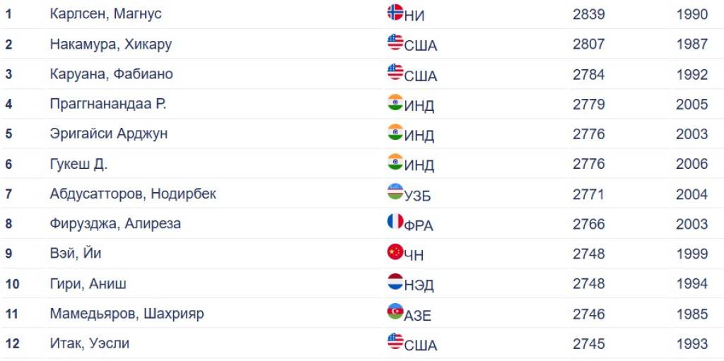 Катталар ўртасида жаҳоннинг энг кучли шахматчилари рейтингида ҳамон норвегиялик Магнус Карлсен етакчилик қилаётган, АҚШлик Хикару Накамура 2-ўринда бораётган вазиятда июнь ойида 4-ўринда қайд этилган америкалик Фабиано Каруана 3-ўринга, Тошкентда ўтган халқаро турнирда ғолибликка эришган ҳиндистонлик Праггнанандхаа 4-ўринга кўтарилиб олди.