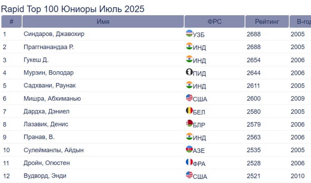 Рапид йўналишида дунёнинг етакчи ёш шахматчиси номини олган Жавоҳир Синдоров ёшлар ўртасида ТОП-100ликда ўтган ойдаги 3-ўрнини сақлаб қолди. Муҳиддин Мадаминов 2553 балл билан икки қатор юқорилаган ҳолда 28-поғонани эгаллади. Муҳаммадзоҳид Суяров (2473) ва Ҳумоюн Бекмуродов(2470) 74-75-ўринлардан жой эгаллади.