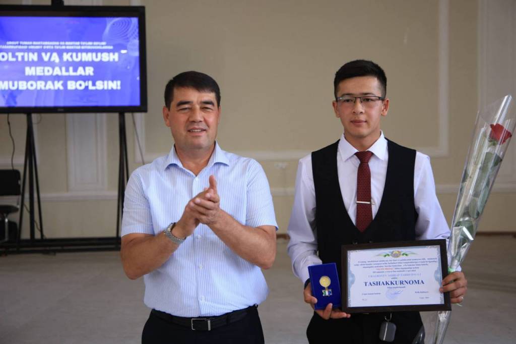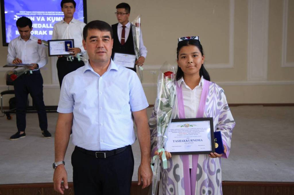 Битирувчиларга медалларни тантанали топшириш маросимда туман ҳокимлиги масъуллари ва туман фаоллари иштирок этиб, истеъдодли ёшларни табриклаб, уларнинг ота-оналарига миннатдорлик билдирдилар.