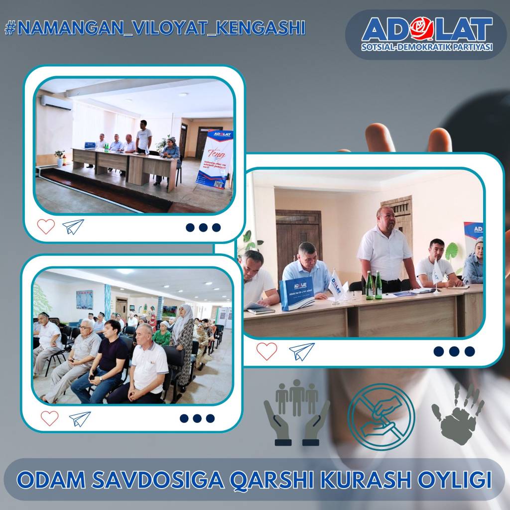 Jumladan, partiyaning Namangan viloyati kengashi tashabbusi bilan Namangan shahridagi 51-sonli umumta’lim maktabida oylik doirasida ma’rifiy tadbir bo‘lib o‘tdi. Odam savdosi kabi global muammoning oldini olish, fuqarolarni xatarlardan ogohlantirish va ularning huquqiy ongini oshirishga qaratilgan tadbirda viloyat markazidagi Mehribonlik, Dashtbog‘ va Ravnaq mahallalari faollari, ta’lim sohasi va huquqni muhofaza qilish organlari vakillari, mahalliy Kengash deputatlari hamda partiya faollari ishtirok etdi.