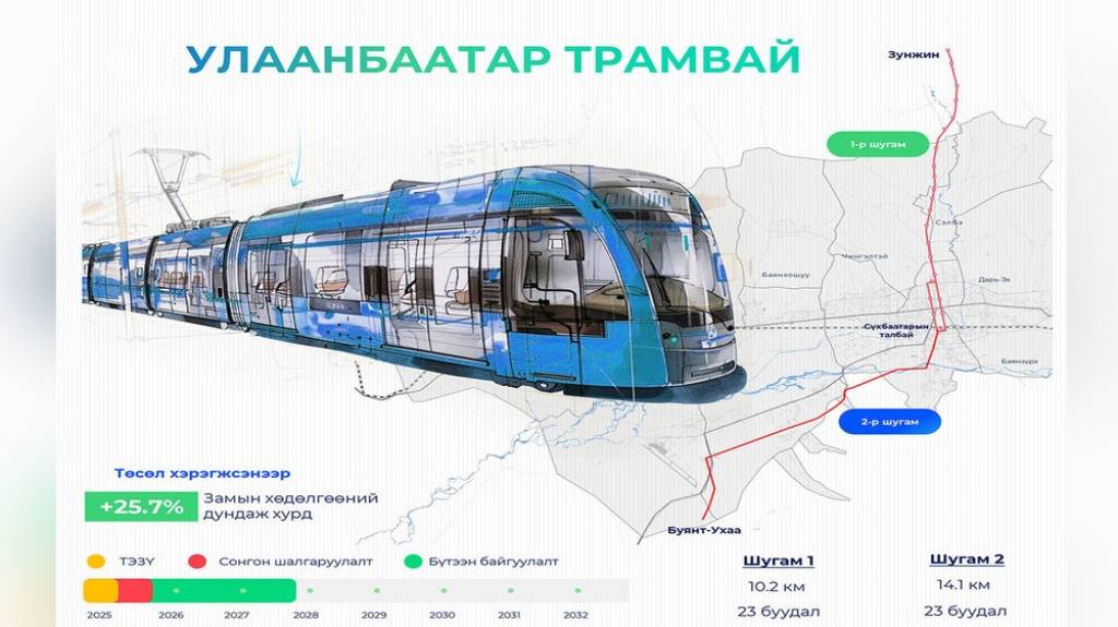 Проект «Уланбаторский трамвай» планируется реализовать по двум маршрутам в столице. Первая линия пройдет от летнего лагеря (торговый центр «Зунжин») до площади Сухэ-Батора, а вторая линия пройдет от офиса Главного архивного управления Монголии до площади Сухэ-Батора. Первая линия двухрельсового трамвая будет охватывать 11 км с 16 остановками, а вторая линия будет охватывать 15 км с 23 остановками.