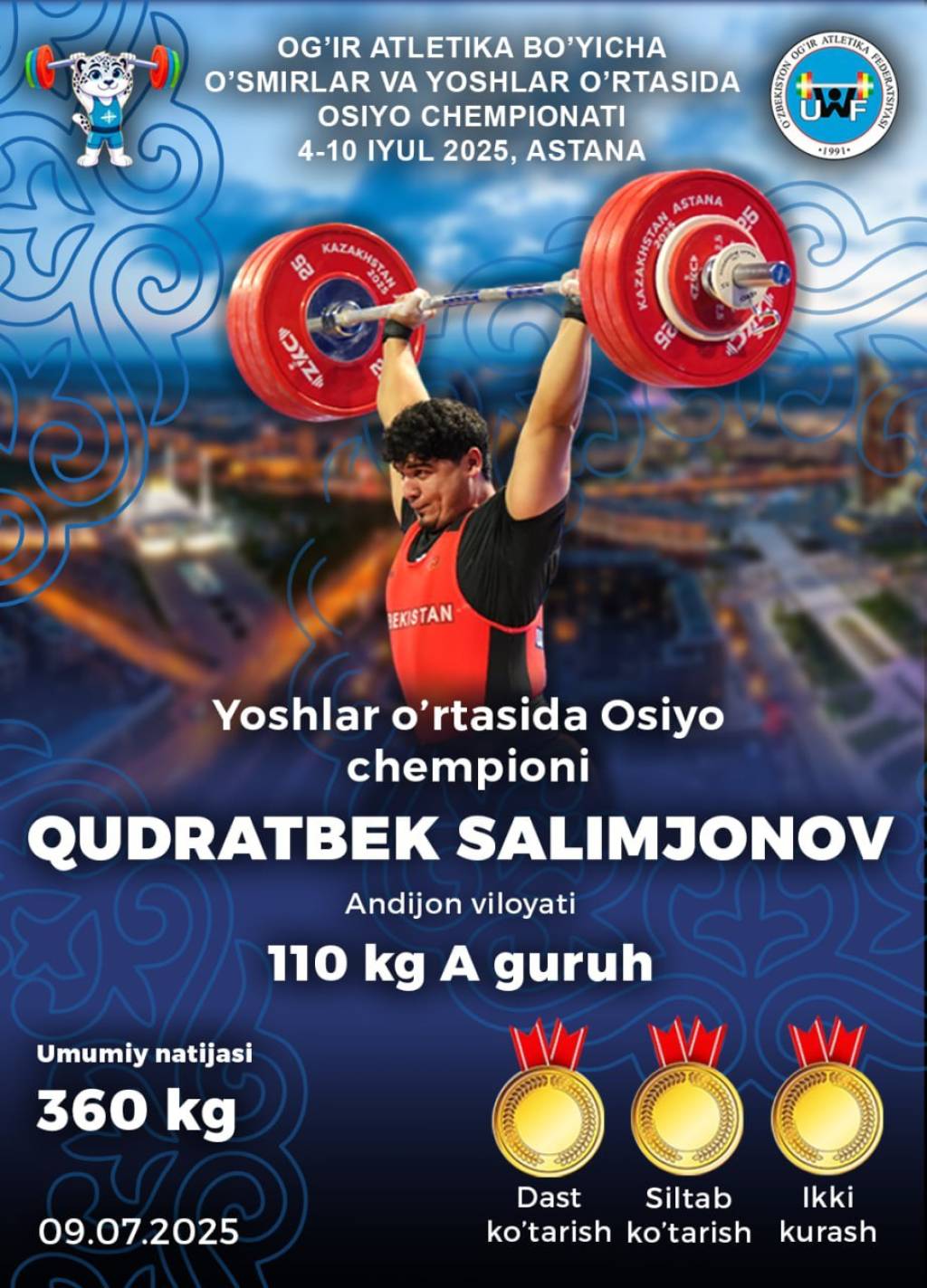 Sportchilarimizdan Omadulla Olimov +110 kilogramm og‘irlikda ikki kurash natijasiga ko‘ra, 351 kilogramm natija bilan kumush medalga ega chiqdi. Shuningdek, o‘z vaznlarida iste’dodli og‘ir atletikachilarimiz Hasanboy Xolmurodov, Mohinur Esonboyeva va Madina Fayzullayeva bronza medallari sohibi bo‘ldi.
