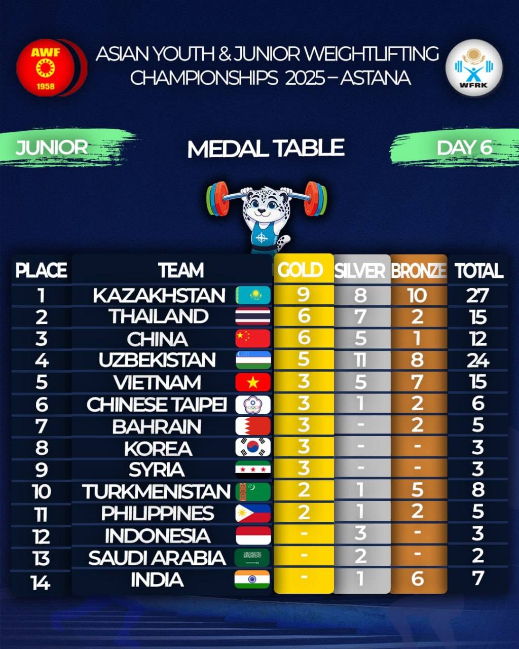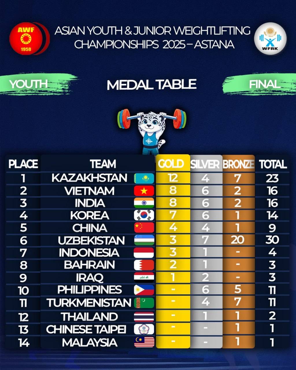 Chempionatning oxirgi kun ostonasida O‘zbekiston o‘smirlar terma jamoasining medallari soni 30 taga yetgan bo‘lsa, yoshlar terma jamoamiz 24 ta medal jamg‘arishga muvaffaq bo‘lib turibdi.