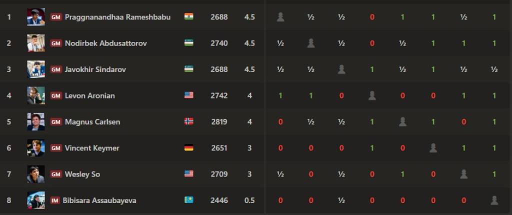 Наши соотечественники Нодирбек Абдусаттаров и Жавохир Синдоров успешно выступили в соревнованиях. Нодирбек Абдусаттаров сыграл вничью с Рамешбабу Праггнанандой из Индии, Магнусом Карлсеном из Норвегии и Жавохиром Синдоровым, победил Уэсли Со из США, Бибисару Асаубаеву из Казахстана и Винсента Каймера из Германии, но уступил Левону Ароняну. А Жавохир Синдоров сыграл вничью с Бибисарой Асаубаевой, Магнусом Карлсеном, Рамешбабу Праггнанандхой, Уэсли Сои и Н. Абдусаттаровым, одержал победу в матчах против Винсента Каймера и Левона Ароняна.