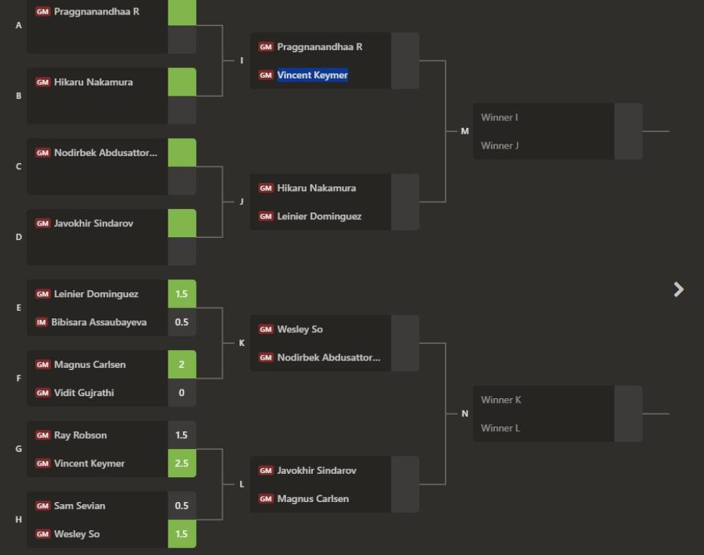 Кеча ўтказилган чорак финал ўйинида Нодирбек Абдусатторов ҳиндистонлик Аржун Эригаисига, Жавоҳир Синдоров америкалик Ҳанс Ниеманнга имкониятни бой бериб қўйди.