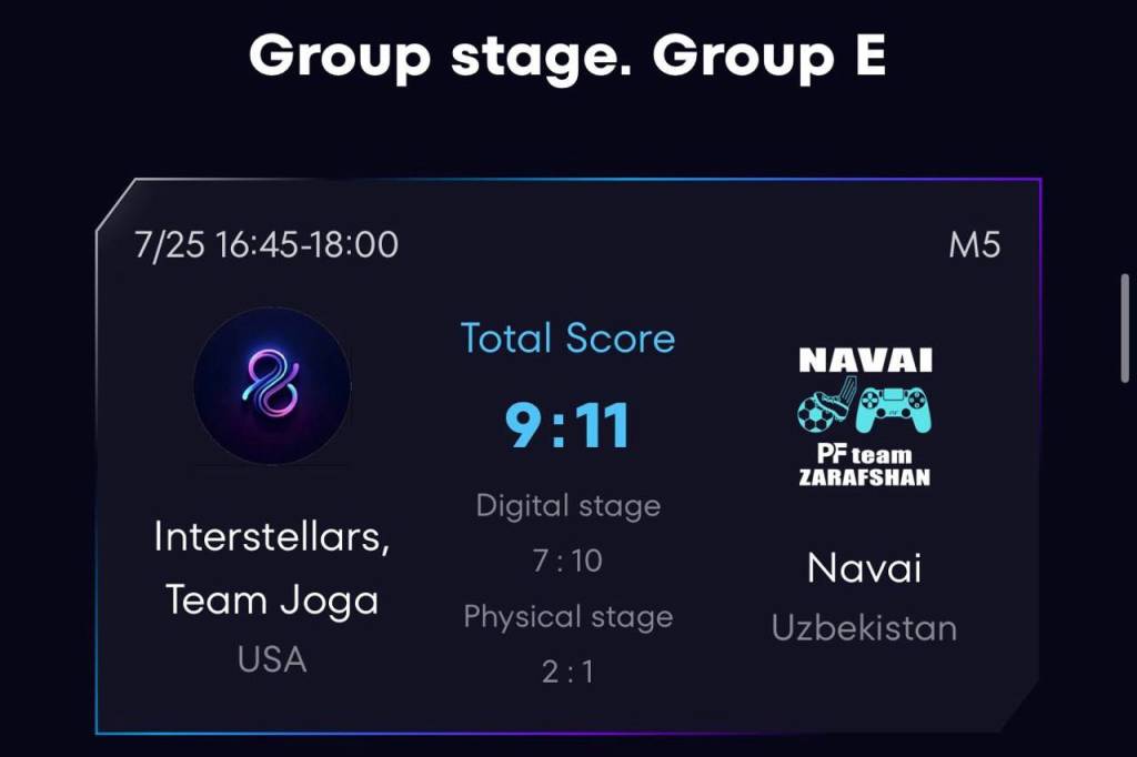 Ushbu turnirning “E” guruhidan joy olgan klubimiz AQSHning “Interstellars, Team Joga” jamoasini 11:9 hisobida yengdi. Endi “Navoiy” jamoasi guruhdagi ikkinchi o‘yinini Keniyaning “IndexG” klubiga qarshi o‘tkazadi.