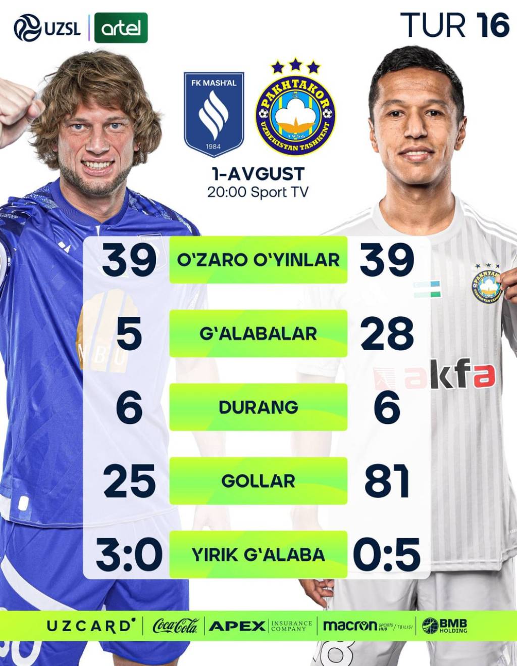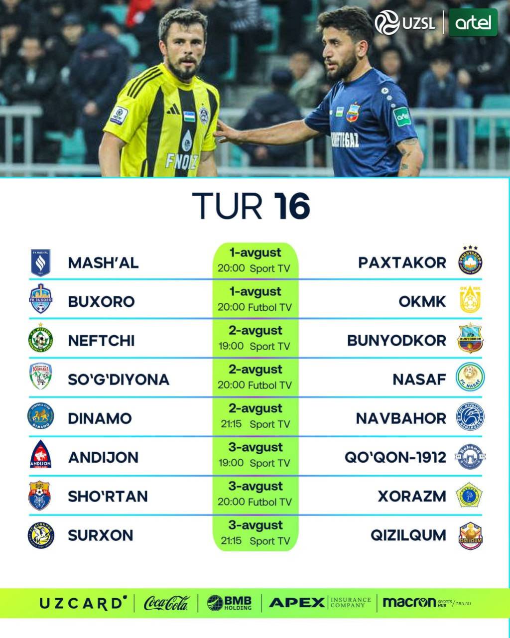 Сегодня в рамках 16-го тура Суперлиги Узбекистана по футболу пройдут матчи «Бухара» – «АГМК» и «Машъал» – «Пахтакор».
