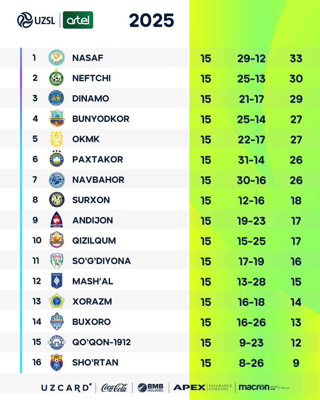 По итогам 15 туров таблицу Суперлиги возглавляет «Насаф» с 33 очками. В тройке лидеров также «Нефтчи» (30 очков) и «Динамо» (29 очков).