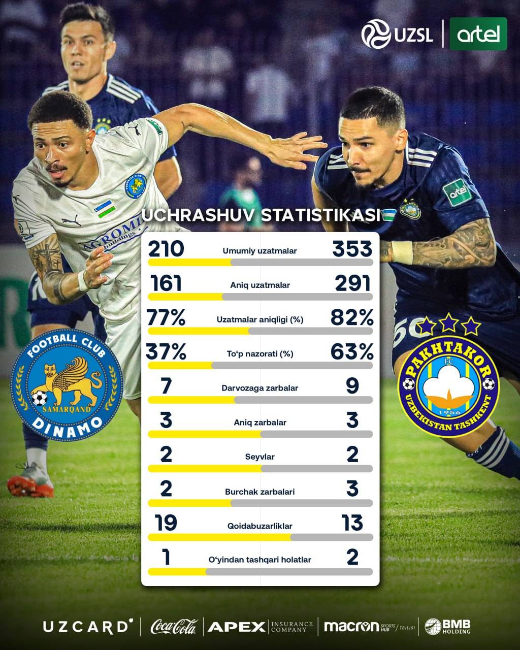 Самарқанд шаҳрида ташкил этилган “Динамо” – “Пахтакор” жамоалари ўртасидаги ўйиннинг 19-дақиқасида Ричард Фрайдей (“Динамо”) 85-дақиқада Бобир Абдихолиқов ҳисобни тенглаштирди. Шу тариқа ушбу ўйин 1:1 ҳисобида якунланди. Шу тариқа “Динамо” 34 очко билан “Пахтакор” эса 30 очко тўплаган ҳолда ҳозирча 3-6 ўринлардан жой олди.