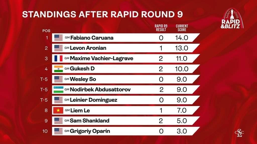 10 ochkoni qo‘lga kiritgan jahon chempioni Dommaradju Gukesh 4-o‘rinni, 9 ochko jamg‘argan Uesli So, Nodirbek Abdusattorov va Lener Dominges keyingi pog‘onalarni band etishdi.