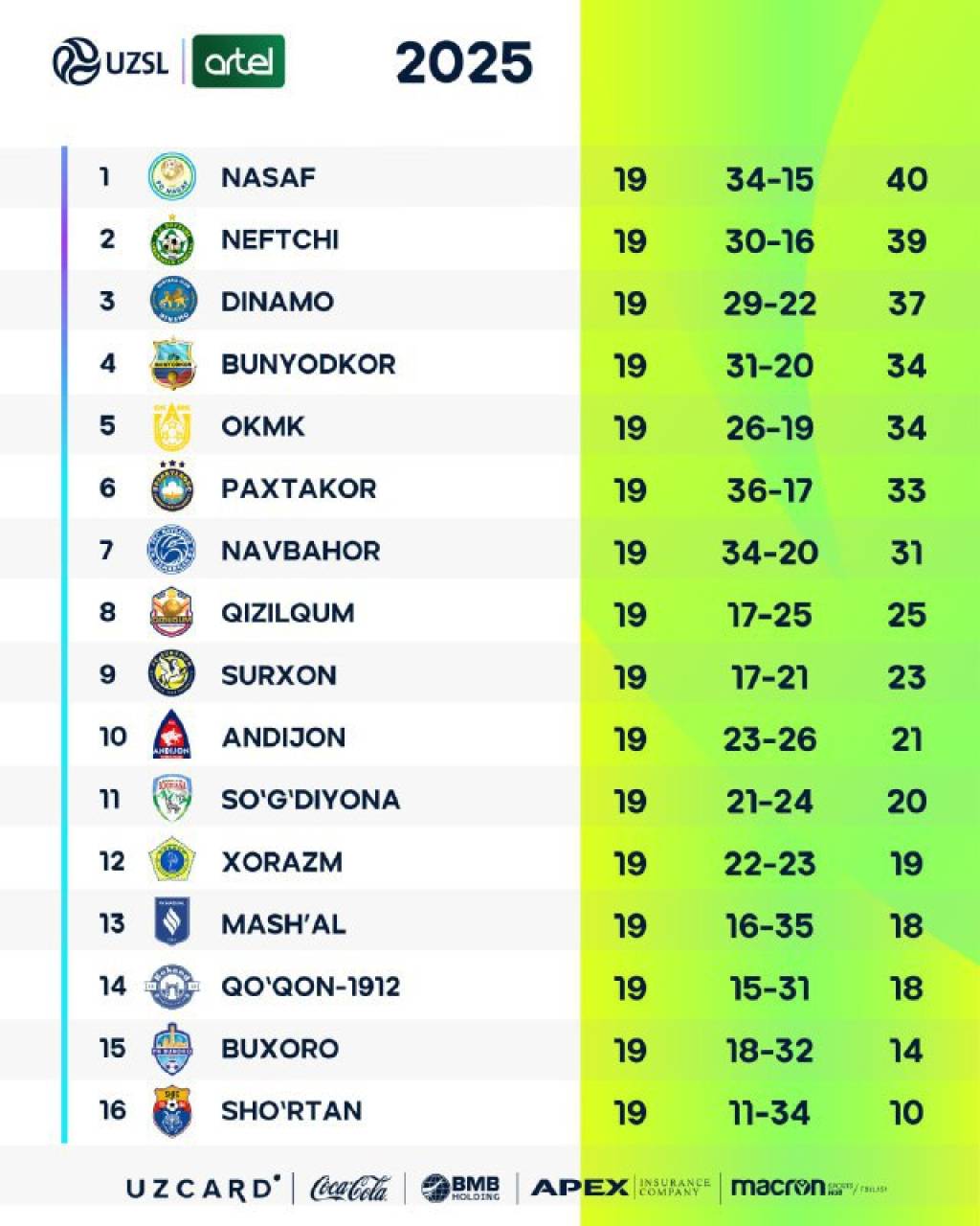 Шу тариқа, ушбу тур якунига кўра, “Насаф” 40 очко билан жадвалнинг энг юқори поғонасида қолди. Бир очкога ортда қолаётган “Нефтчи” иккинчи ўринда бораётган бўлса, “Динамо” 37 очко жамғариб, кучли учликдан жой олди. Улар ортидан “Бунёдкор” ва ОКМК 34, “Пахтакор” эса 33 очко жамғарган ҳолда кейинги поғоналарда бормоқда.
