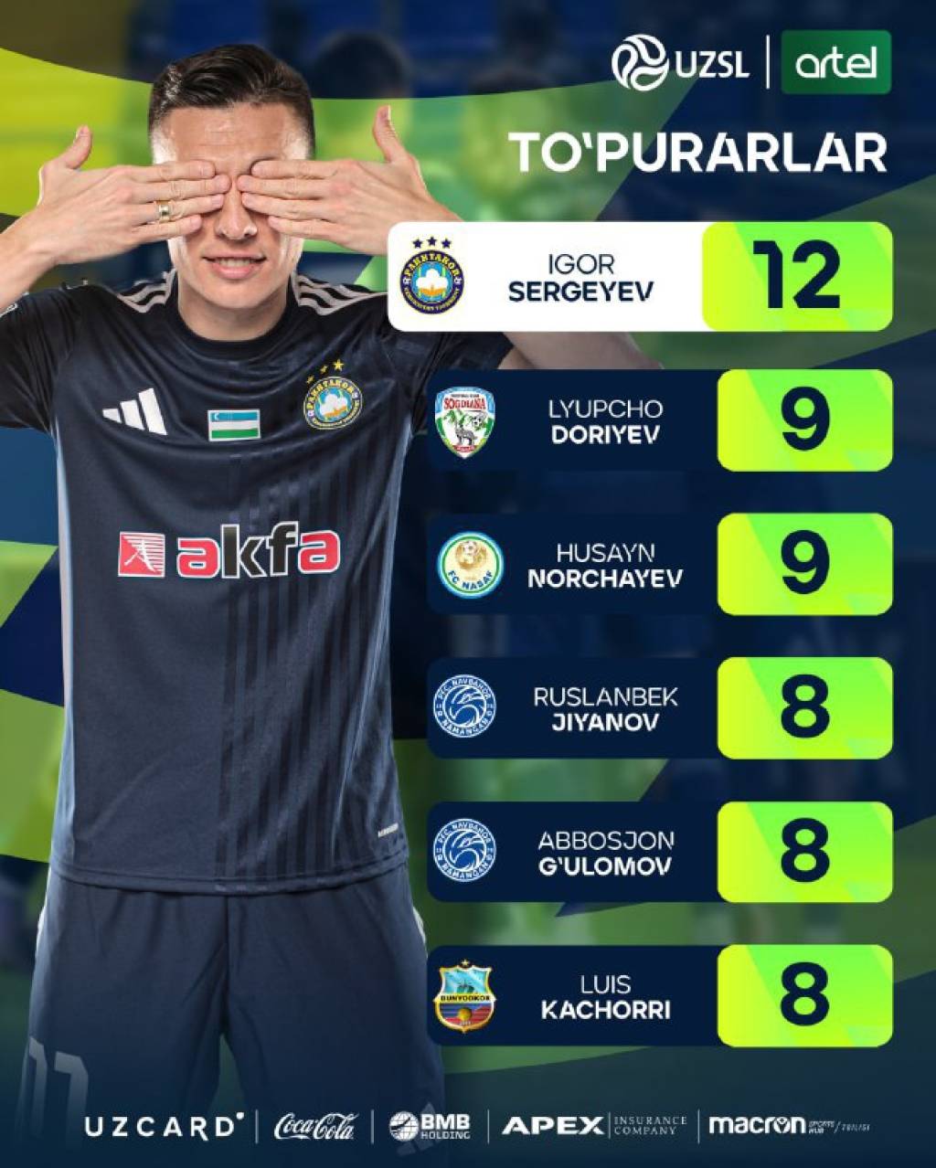 Ўзбекистон Суперлигасида энг кўп гол урган футболчи сифатида “Пахтакор” ҳужумчиси Игорь Сергеев эътироф этилмоқда. Унинг ҳисобида ҳозиргача 12 та гол бор. Кейинги ўринларда 9 тадан гол билан “Сўғдиёна” етакчиси Люпчо Дориeв ва “Насаф” ҳужумчиси Ҳусайн Норчаев жойлашган.