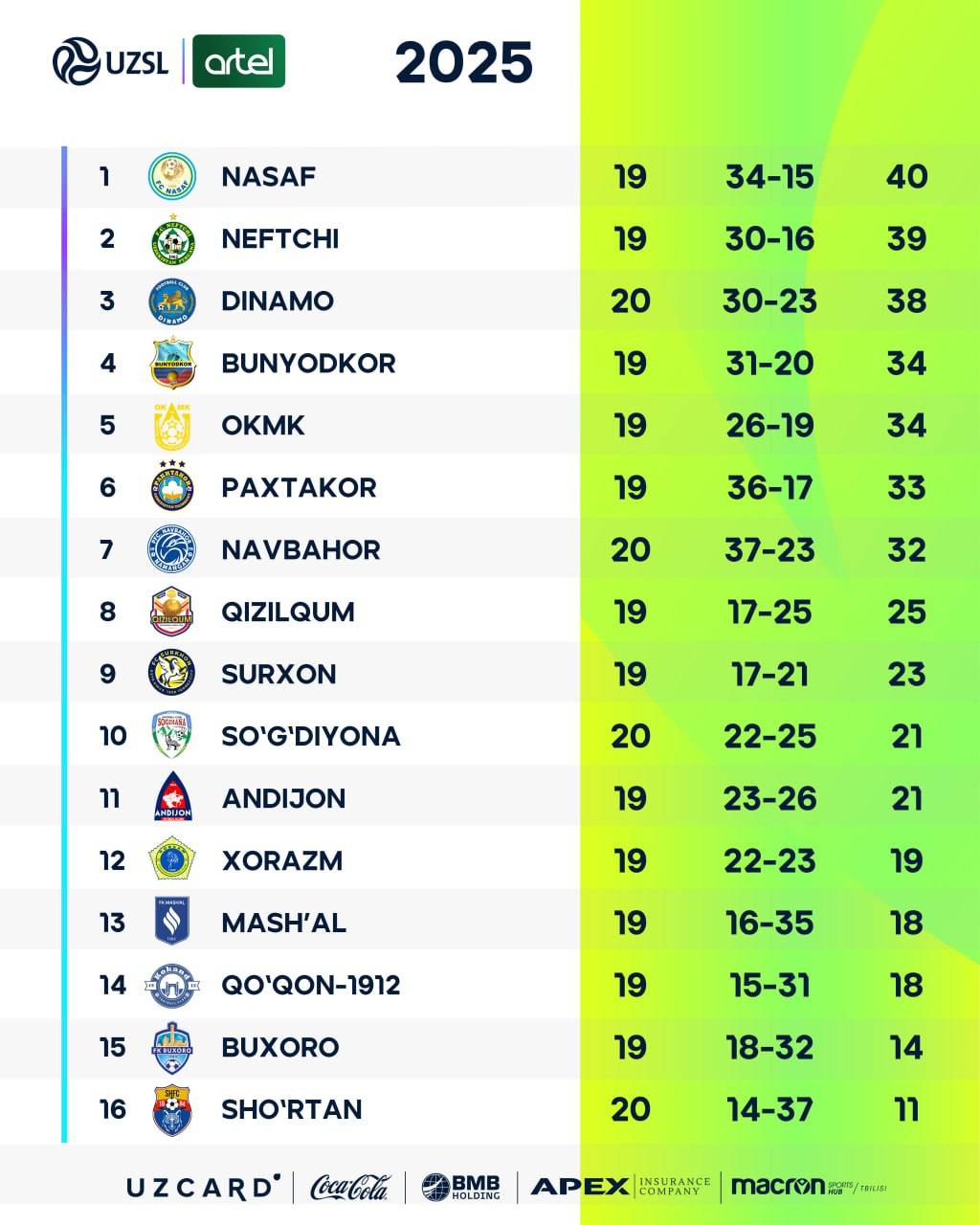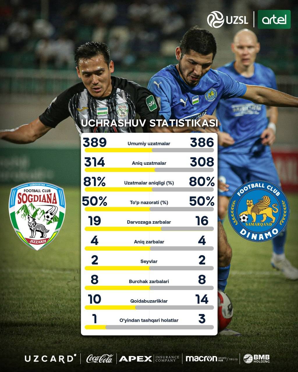 Futbol bo‘yicha O‘zbekiston chempionati superligasi 20-turidan o‘rin olgan Jizzaxning “So‘g‘diyona” va Samarqandning “Dinamo” jamoalari o‘rtasidagi bahs Jizzax markaziy stadionida bo‘lib o‘tdi. Stadion muxlislar bilan to‘ldi.