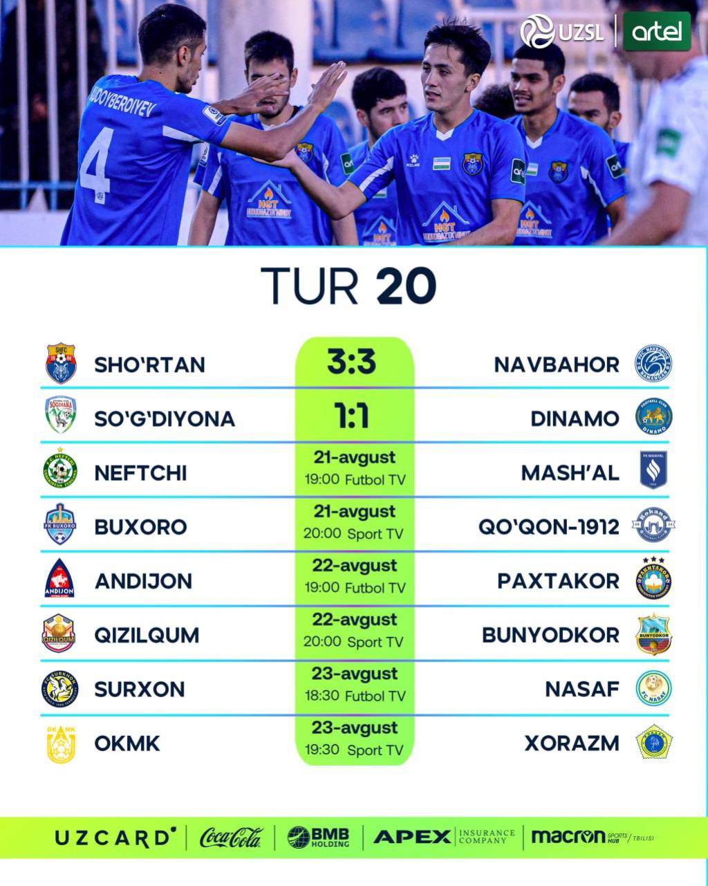 20-turning qolgan bahslari 21- 23 avgust kunlari bo‘lib o‘tadi.