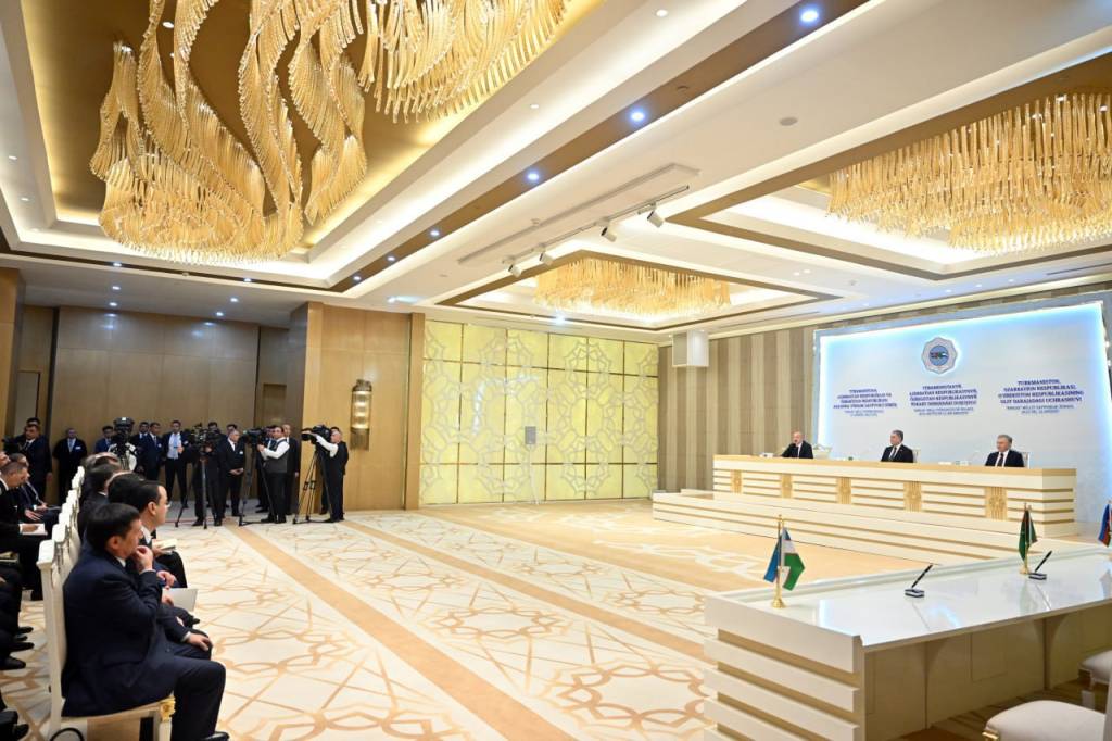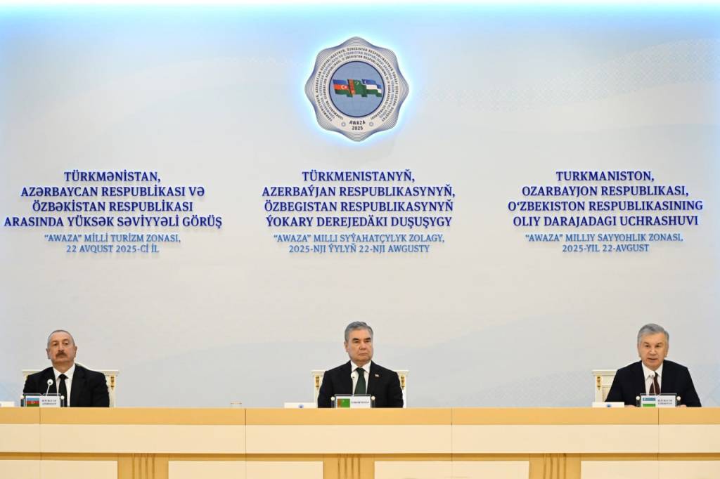 O‘zbekiston Respublikasi Prezidenti Shavkat Mirziyoyev, Turkman xalqining milliy yetakchisi, Xalq Maslahati Raisi Gurbanguli Berdimuhamedov va Ozarbayjon Respublikasi Prezidenti Ilhom Aliyev muzokaralar yakunida ommaviy axborot vositalari uchun bayonot berdilar.