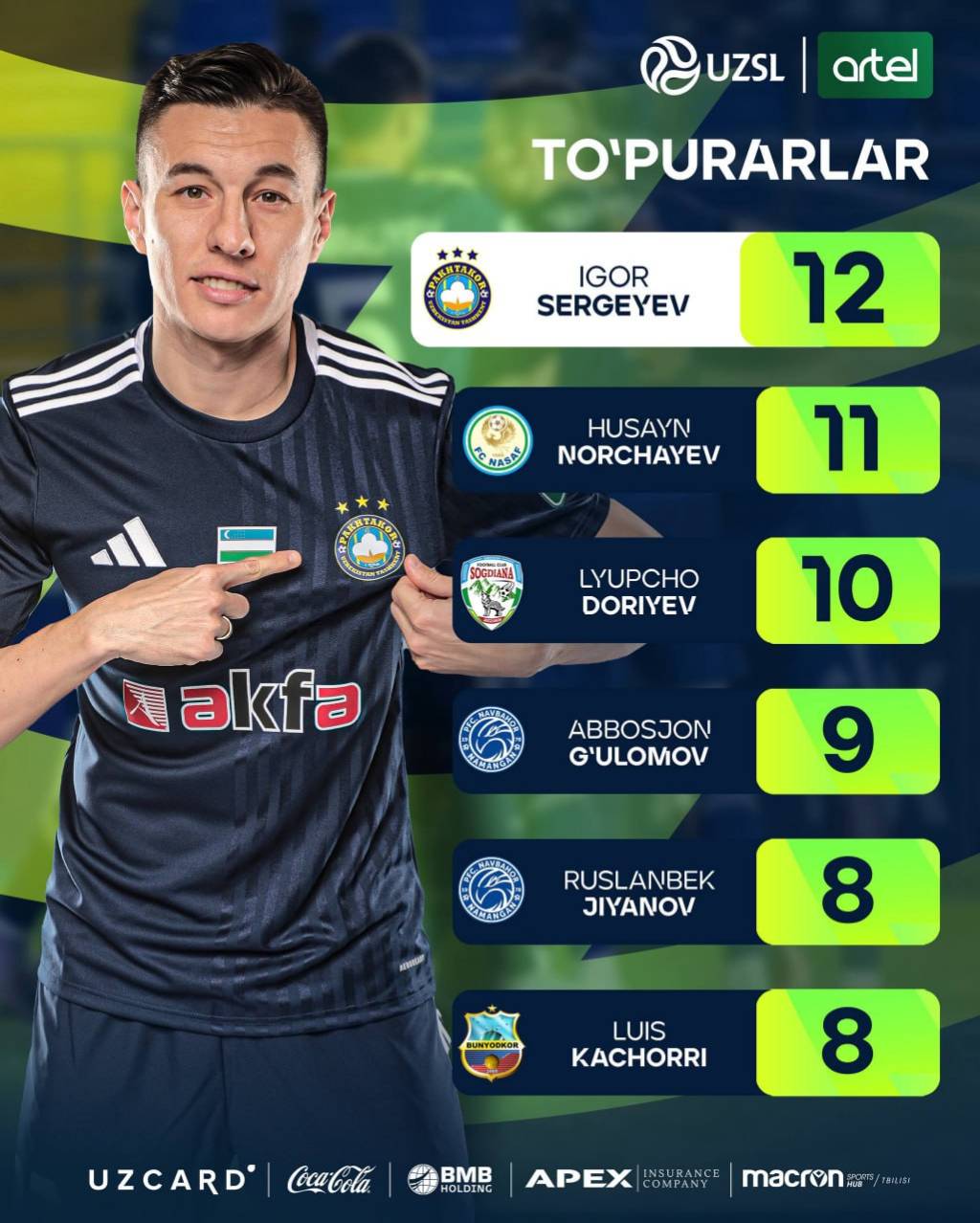 Milliy chempionatimizda o‘zining yorqin o‘yinlarini namoyish etayotgan Igor Sergeyev ("Paxtakor") ayni damda 12 ta gol urgan holda Superliga to‘purarida karvon boshilik qilmoqda. Uni Husayn Norchayev ("Nasaf") 11ta gol bilan taq’ib etmoqda. "So‘g‘diyona" futbolchisi Lyupcho Doriyev 10 ta gol urgan holda ushbu ro‘yxatning uchinchi pog‘onasidan o‘rin oldi.