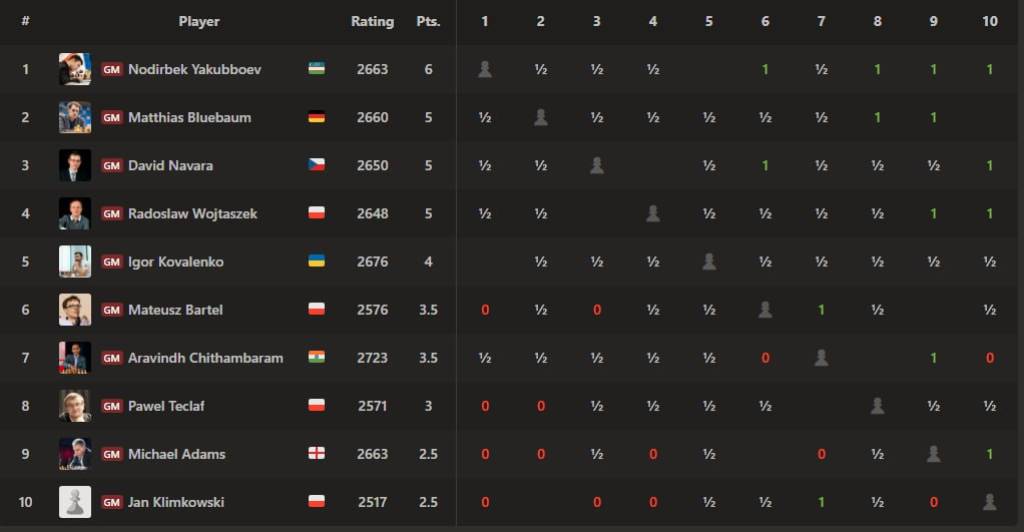 Сўнгги турда Ёқуббоев қора доналарда 4 очко билан 5-поғонада бораётган украиналик Игорь Коваленко билан рўбарў келса, Матеуш Бартел Польша вакили Ян Климковскига, Давид Навара Радослав Войташекка қарши баҳс олиб боради.