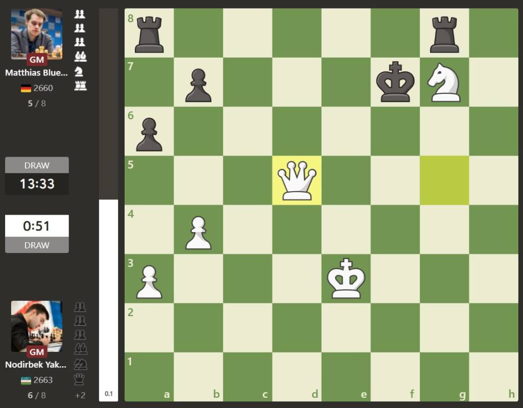 Қизиқарли кечган баҳсда Ёқуббоев ғалабага яқин эди. Аммо, айрим вазиятлардаги ноаниқ ҳаракатлар турни дуранг билан якунланишига олиб келди. Ушбу натижа терма жамоамиз аъзосини “61st Rubinstein Memorial-2025” турнири ғолиблигига яна бир қадам яқинлаштирди.