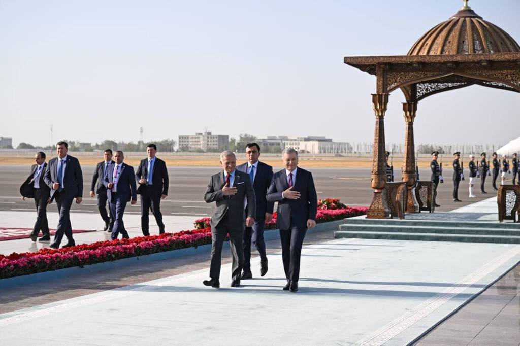Олий мартабали меҳмон шарафига икки мамлакат давлат байроқлари кўтарилди, фахрий қоровул саф тортди.