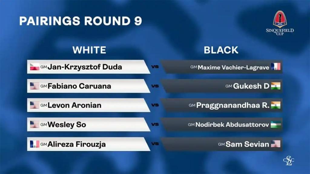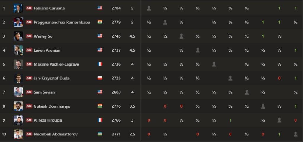 So‘nggi tur ostonasida amerikalik Fabiano Karuana va hindistonlik Rameshbabu Praggnanandxa 5 ochko bilan peshqadamlik qilayotgan vaziyatda 4,5 ochkoga ega Levon Aronyan 3-o‘rinda bormoqda.
