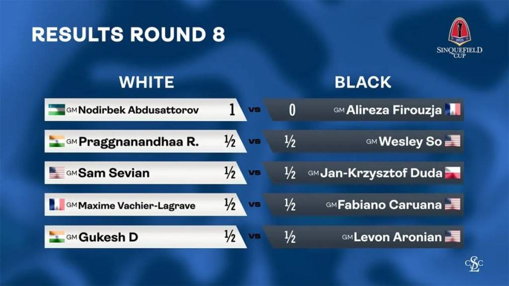 10 nafar eng kuchli grossmeysterlar qatnashayotgan mazkur turnirning kecha o‘tkazilgan 8-turida Nodirbek Abdusattorov ketma-ket omadsizliklardan keyin musobaqadagi ilk g‘alabasini tantana qildi. Oq donalarda fransiyalik Alireza Firuzjaga qarshi harakatlangan hamyurtimiz 60-yurish holatida raqibini taslim etdi.
