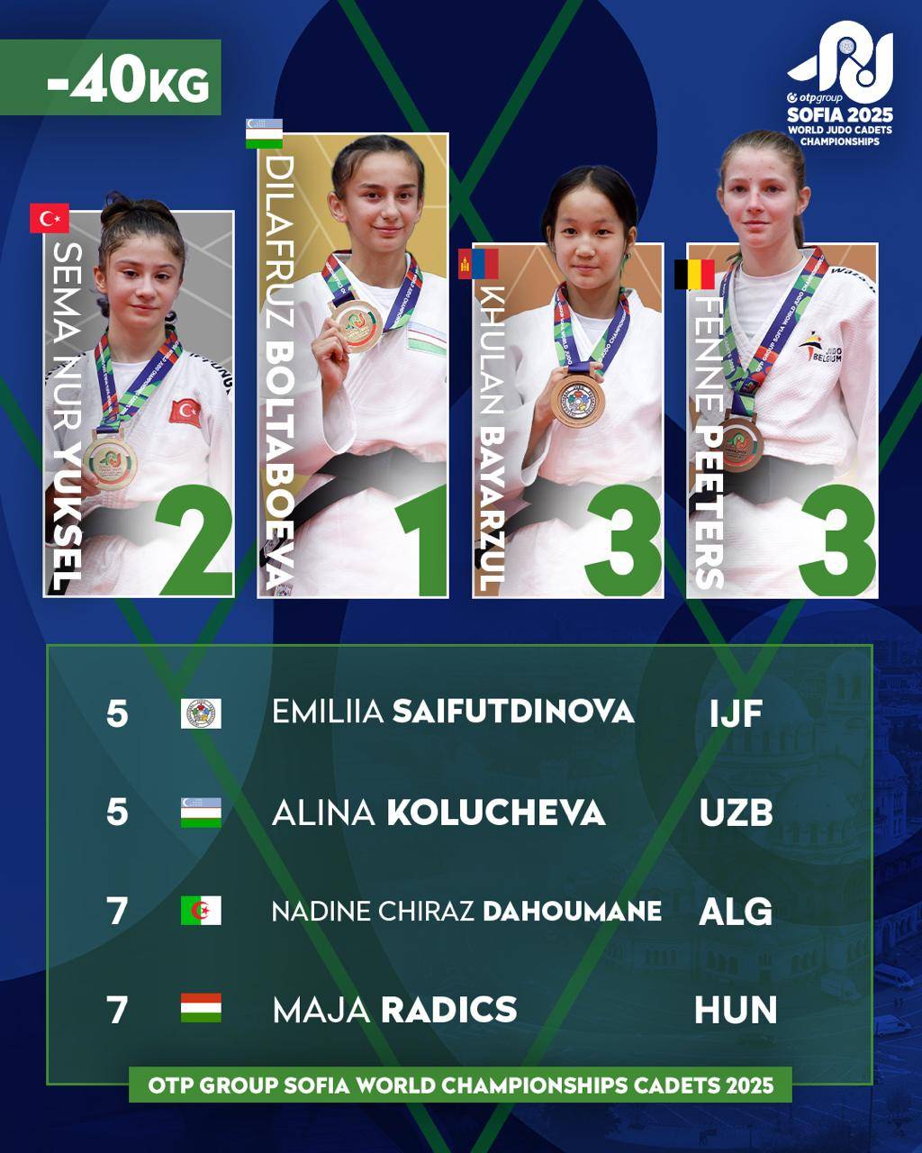 Jumladan, musobaqaning vazni 40 kilogrammgacha bo‘lgan qizlar o‘rtasidagi bellashuvlarida Dilafro‘z Boltaboyeva barcha raqiblarini yengib, oltin medalni qo‘lga kiritdi va mazkur yosh toifasidagi jahon chempionatida g‘alaba qozongan o‘zbekistonlik ikkinchi dzyudochi qizga aylandi.