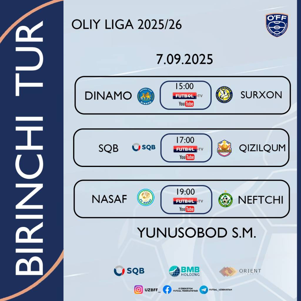 Бугун, 7 сентябрь куни пойтахтимиздаги “Юнусобод” спорт мажмуасида футзал бўйича давом этаётган Олий лига 1-тур ўйинларининг сўнгги учрашувлари бўлиб ўтади.