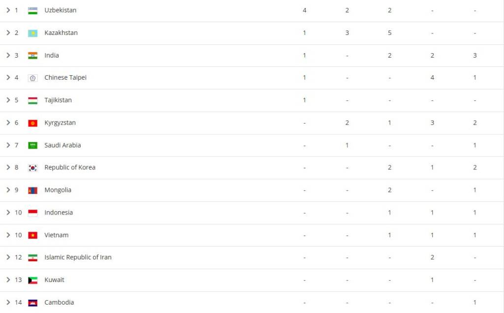 Ушбу натижа орқали терма жамоамиз Осиё қитъасининг 21 давлати орасида умумжамоа ҳисобида биринчи ўриндан жой олди. Қозоғистон термасида 1 та олтин, 3 та кумуш, 5 та бронза медали бор. Ҳиндистонлик дзюдочилар эса дастлабки кун якунига кўра 1 та олтин ва 2 та бронза медали билан кучли учликдан жой олди.