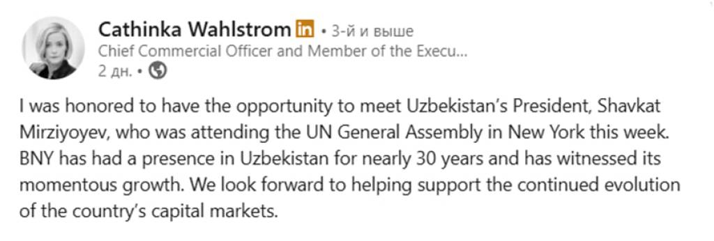 Куни кеча BNY компанияси бош тижорат директори Кэтинка Вальстрём ижтимоий тармоқдаги саҳифасида Нью-Йорк шаҳрида бўлиб ўтган БМТ Бош Ассамблеяси 80-сессияси доирасида Ўзбекистон Президенти Шавкат Мирзиёев билан кечган учрашув ўз жамоаси кейинги фаолиятига сезиларли ижобий таъсир кўрсатишини эътироф этди.