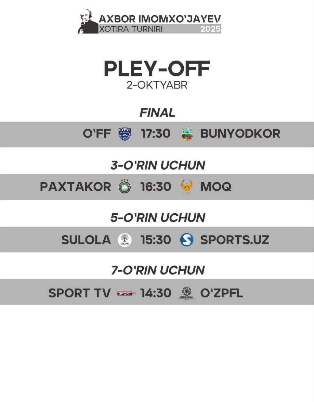 Shuningdek bugun 3-o‘rin uchun kechadigan bahsda “Paxtakor” Milliy olimpiya qo‘mitasi jamoasi bilan kuch sinashsa, 5-o‘rinni qo‘lga kiritadigan jamoalar nomi “Sulola” hamda “Sport.uz” qarama-qarshiligidagi o‘yin natijasida ma’lum bo‘ladi.
