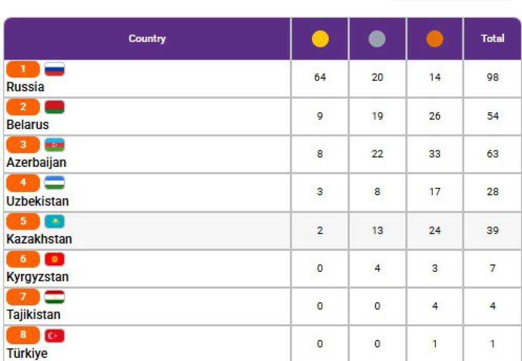Етакчилик борасида россиялик спортчилар 96 (64-19-13) та медаллар жамланмаси билан карвонбошилик қилаётган вазиятда Озарбайжон вакиллари 62 та (8-21- 33) медаль билан иккинчи, Беларус спорт делегацияси 52 та (7-19-26) совринли ўрин билан учинчи ўринда бормоқда.