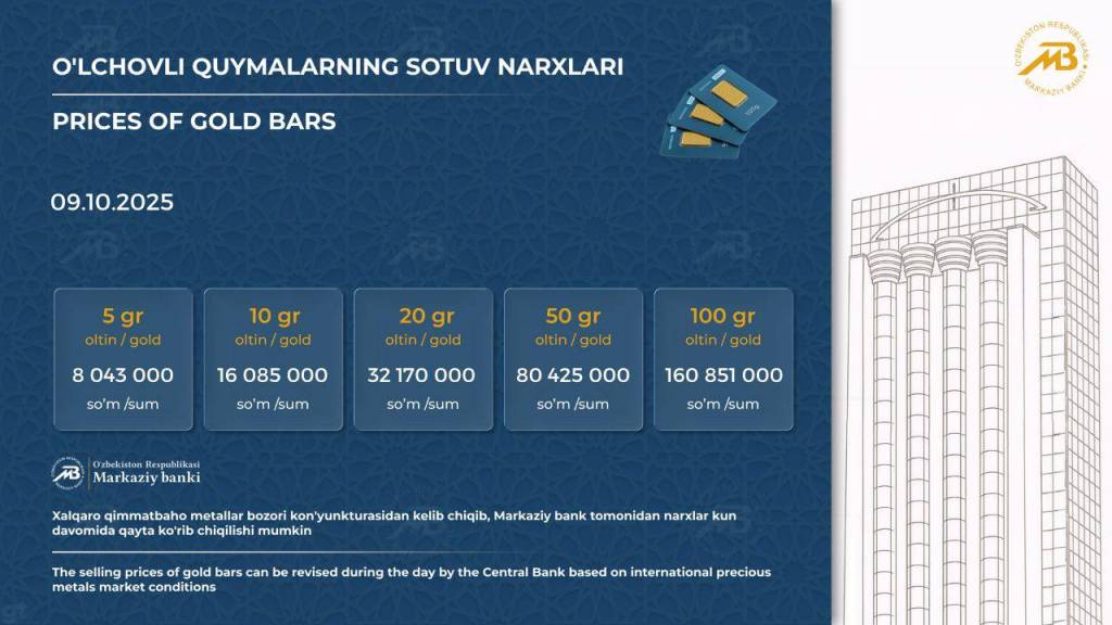 Маълумот ўрнида айтиш жоиз, олтин қуймаларнинг ҳар кунги нархлари Марказий банкнинг расмий веб-сайтида миллий валютада эълон қилинади.