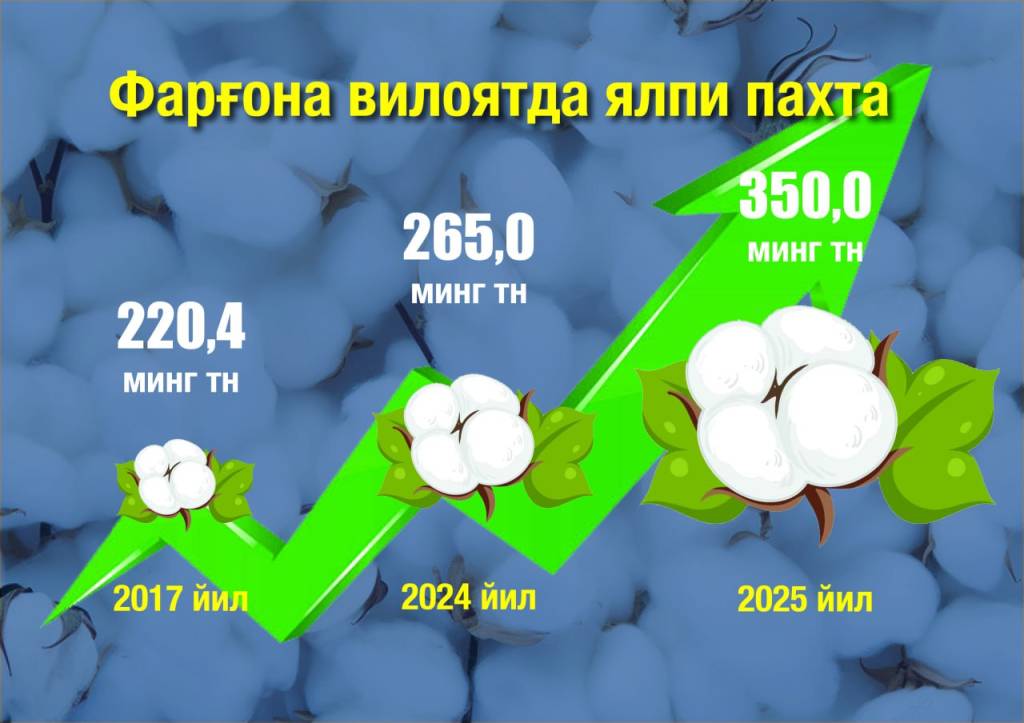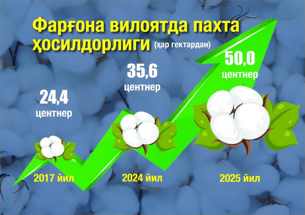 Farg‘ona viloyati tarixida 2025 yil alohida iz qoldirishi aniq. Albatta, iqtisod, qurilish, ma’naviyat sohalarida ulkan natijalarga erishilyapti. Lekin paxtachilikda... Ilgari o‘rtacha paxta xosildorligi mamlakatda ham, viloyatda ham 25-30 sentnerdan oshmagan.