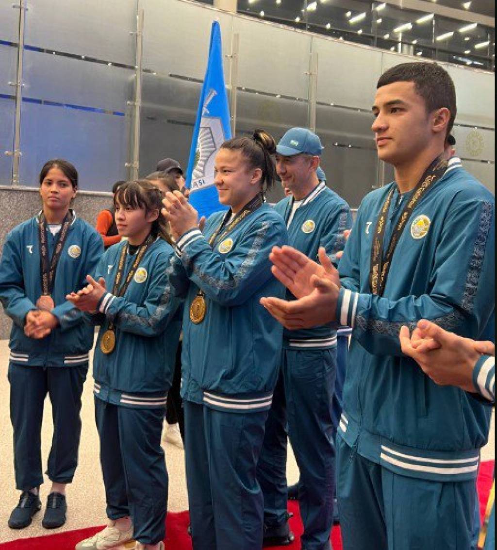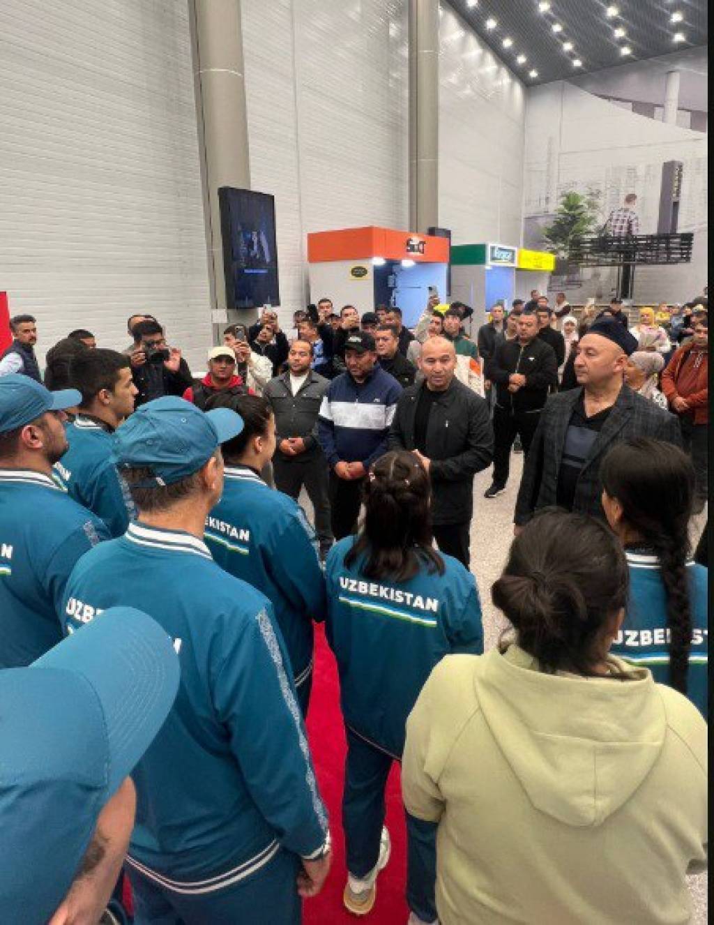 Сегодня в международном аэропорту Ташкента состоялась торжественная встреча наших спортсменов, успешно выступивших на III юношеских Азиатских играх в Бахрейне в дисциплинах кураш и пенчак-силат.