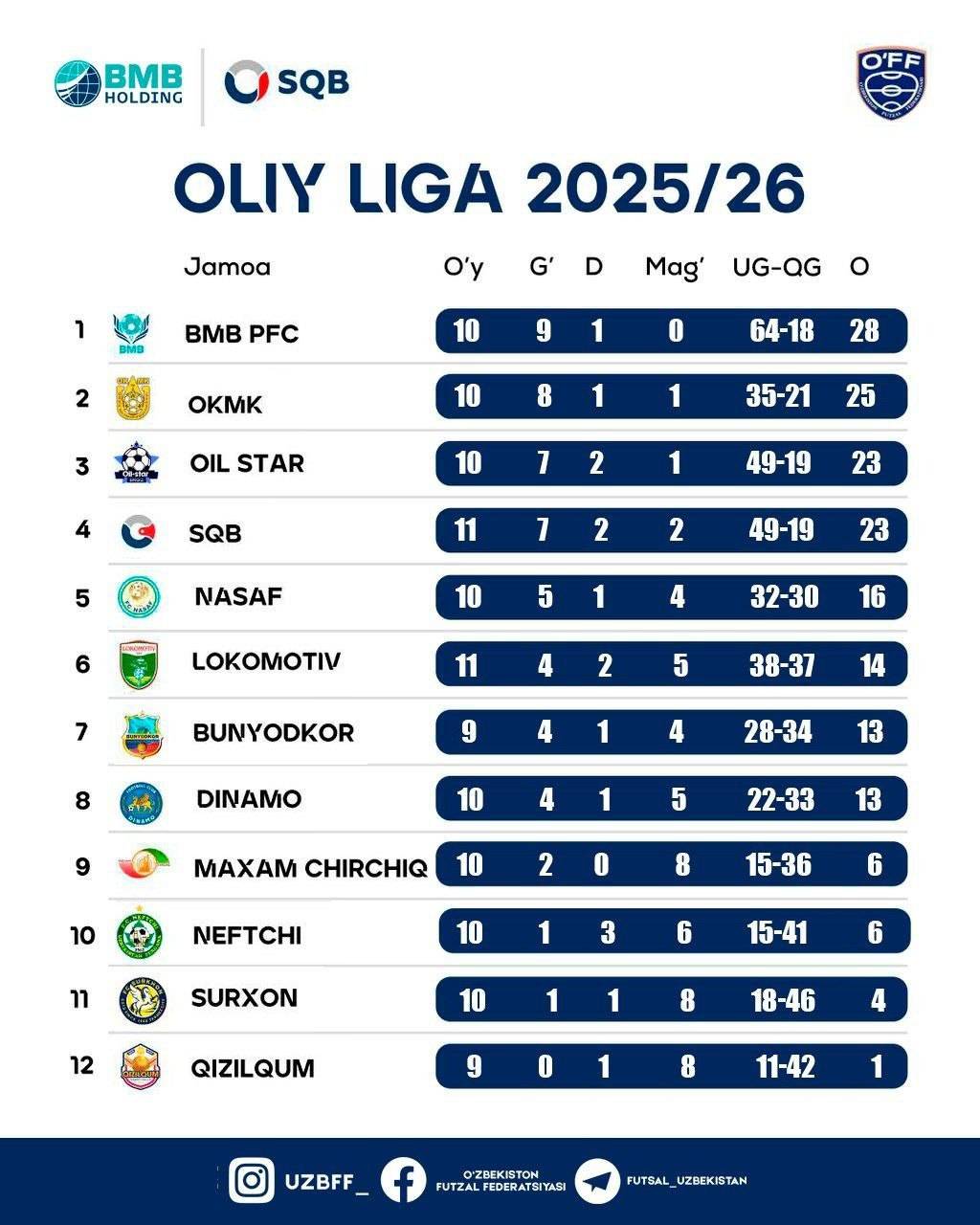 Ортда қолган икки кунлик ўйинлар сарҳисобига кўра, турнир жадвалини 28 очко билан Жиззахнинг "BMB PFC" жамоаси боқариб турибди. Кейинги ўринлардан жой олган ОКМК ҳисобида 25, "Oil Star" ва SQB жамоаларида 23 тадан очко мавжуд.