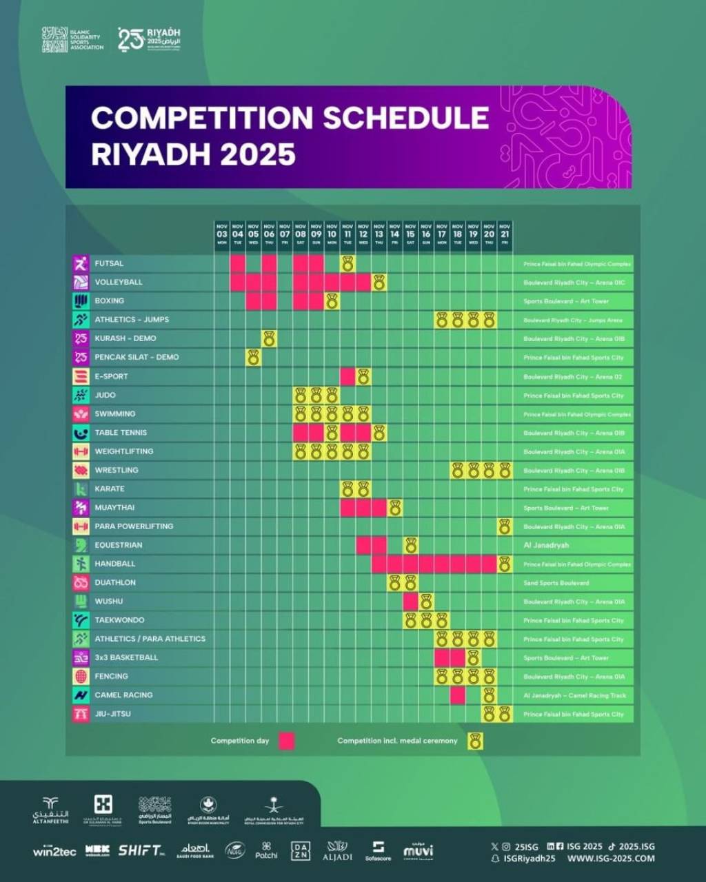 Куни кеча 23 та спорт тури бўйича кечадиган VI “Ислом бирдамлиги” ўйинларининг тўлиқ тақвими эълон қилинди.
