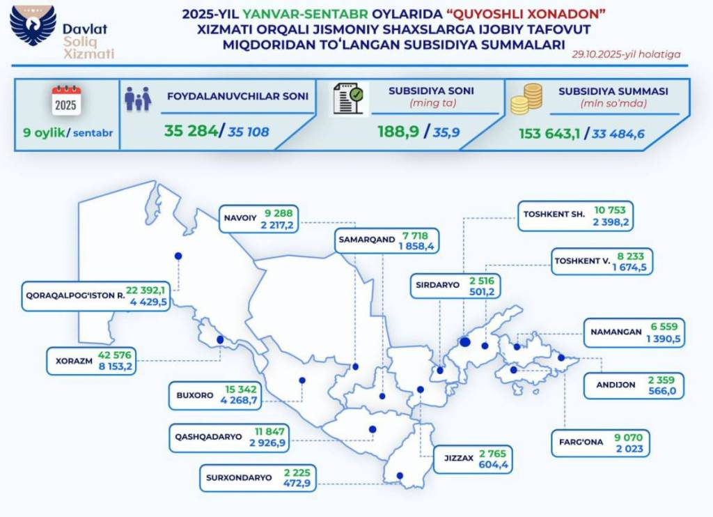 Солиқ қўмитасининг маълум қилишича, жорий йилнинг январь–сентябрь ойларида 35 минг 284 нафар жисмоний шахс электр тармоқларига узатилган қуёш энергияси учун давлат бюджети ҳисобидан 153 миллиард 643 миллион сўм субсидия олди.