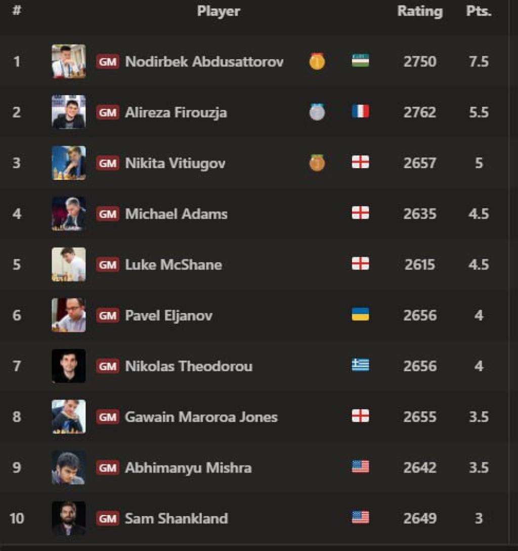 10 нафар маҳоратли шахматчилар иштирок этган турнирда 6 та ғалаба ва 3 та дуранг натижа билан олтин медалга эга чиққан Нодирбек Абдусатторов 25 минг, кумуш медал соҳиби Алиреза 15 минг ва бронза медали соҳиби Витюгов эса 10 минг фунт стерлингга эга чиқди.