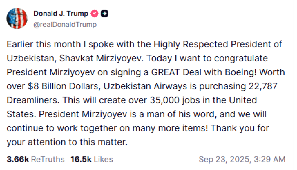 – Шу ой бошида Ўзбекистон етакчиси билан суҳбатлашган эдим. Бугун мен Президент Мирзиёевни “Boeing” иштирокида муҳим битим имзолангани билан табриклайман! Ушбу келишув туфайли Қўшма Штатларда 35 000 дан зиёд иш ўрни яратилади. Президент Мирзиёев – бир сўзли инсон ва биз яна кўплаб масалалар бўйича бирга ишлашда давом этамиз! Бу масалага эътибор учун ташаккур.