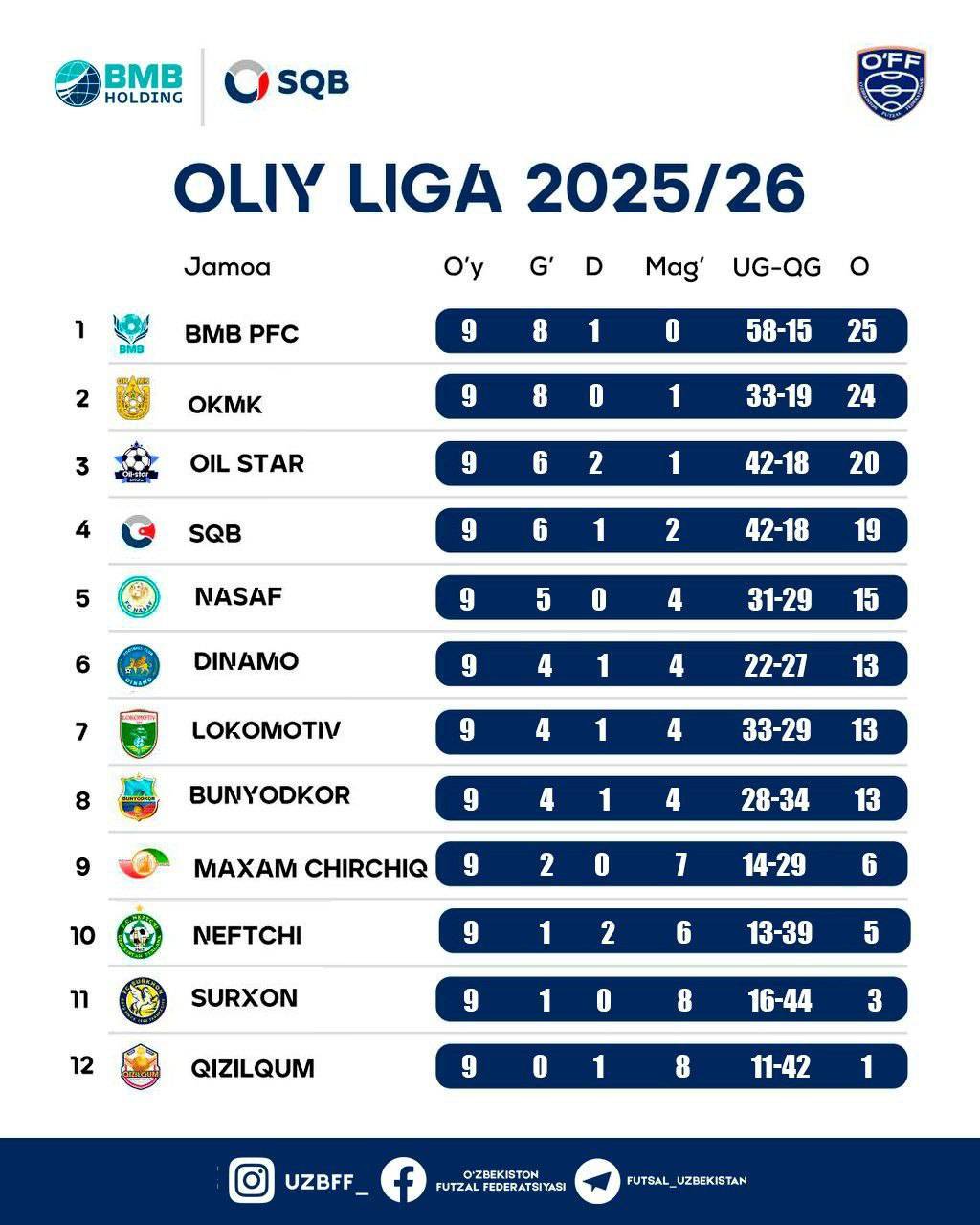 Қайд этилган натижалар якунига кўра, “БМБ” жамоаси 25 очко жамғариб, мусобақа жадвалида пешқадамга айланди. ОКМК эса 24 очко билан иккинчи, “Oil star” эса 20 очко тўплаб, учинчи поғонадан жой олди. “SQB” жамоаси очколарини 19 тага етказган ҳолда 4-ўринда қолган бўлса, “Насаф” 15 очко билан кучли бешликни якунлаб берди.
