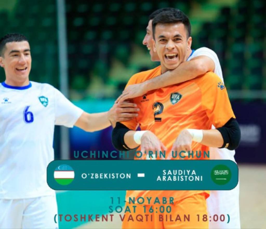 Бугун, 11 ноябрь куни Саудия Арабистонининг пойтахти Ар-Риёд шаҳрида ўтказилаётган VI Ислом Бирдамлиги ўйинларида футзал бўйича Ўзбекистон миллий терма жамоаси бронза медали йўлида Саудия Арабистони жамоаси билан рўбарў келади.