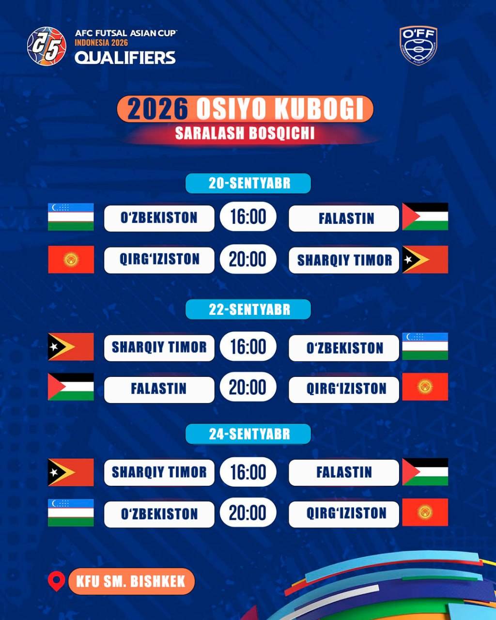 Биз учун аҳамиятлиси, Ўзбекистон миллий терма жамоаси Бишкек шаҳрида ўтказиладиган “F” гуруҳи саралаш баҳсларида иштирок этади. Ҳамюртларимиз бугун илк учрашувини Фаластин терма жамоасига қарши ўтказади. Ўйин соат 15:00 да бошланади. Шунингдек, футзалчиларимиз 22 сентябрь куни Шарқий Тимор, 24 сентябрда эса Қирғизистон терма жамоасига қарши майдонга чиқади.