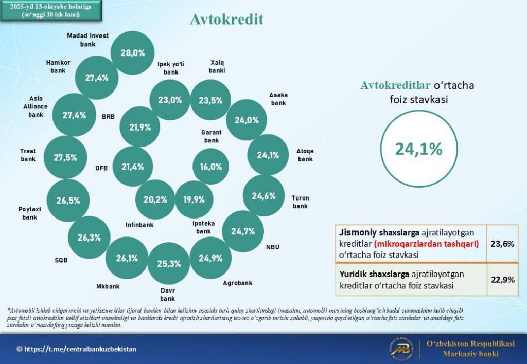Автокредитлар соҳасида ҳозирча катта ўзгариш кузатилмаган. Ҳозирги вақтда бу турдаги кредитлар ўртача 24,1 фоиз атрофида ажратилмоқда.