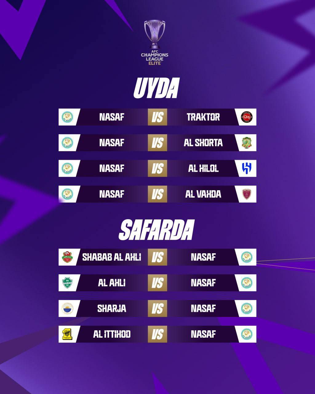 Қуръа натижасига кўра, "Насаф" ўз майдонида "Трактор", "Ал-Шорта", “Ал-Ҳилол" ва "Ал-Ваҳда", сафарда "Шабаб Ал-Аҳли, "Ал-Аҳли", "Шаржа" ҳамда "Ал-Иттиҳод" жамоалари билан рақобатлашади.