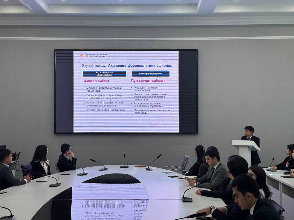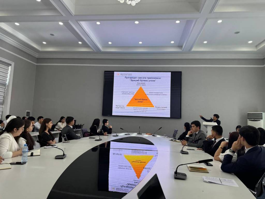 Жаҳон иқтисодиёти ва дипломатия университетида “Пул-кредит сиёсати орқали иқтисодиётни тартибга солиш: асосий тушунчалар ва тамойиллар” мавзусида Марказий банк вакиллари иштирокида семинар-тренинг ўтказилди.