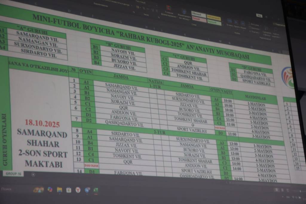 Эртага, 18 октябрь куни Самарқанд шаҳрида Ўзбекистон Республикаси Спорт вазирлиги ҳамда тизим ташкилотлари марказий аппарати ходимлари ўртасида спортнинг мини-футбол тури бўйича "Раҳбар кубоги" спорт ўйинлари бошланади.