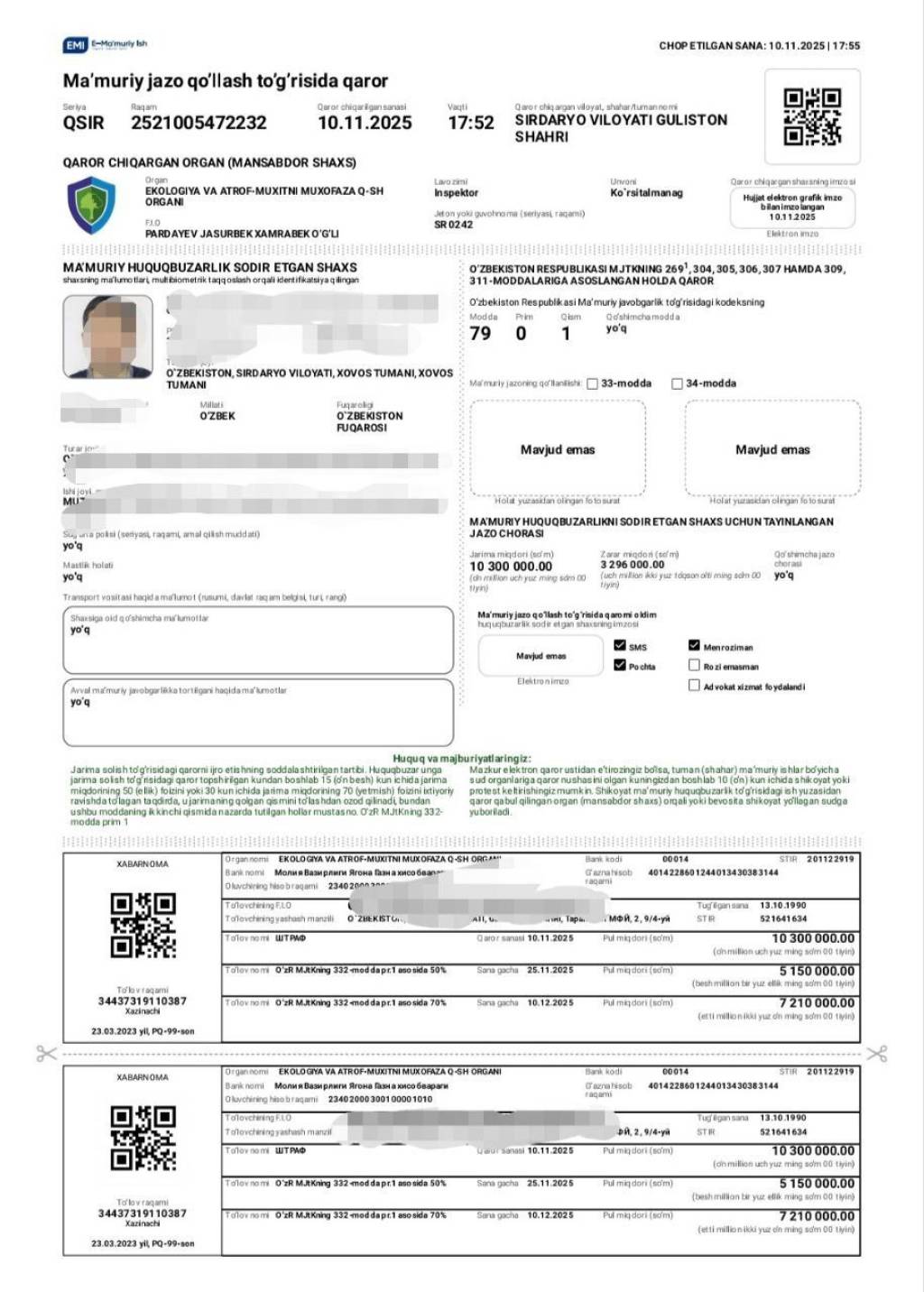 Сирдарё вилояти Экология бошқармаси давлат инспекторлари томонидан ўрганиш натижасида ҳуқуқбузарга нисбатан Ўзбекистон Республикаси Маъмурий жавобгарлик тўғрисидаги кодекснинг 79-моддаси 1-қисми асосида маъмурий баённома расмийлаштирилди ва 10 миллион 300 минг сўм жарима қўлланди. Табиатга етказилган зарар эса 3 миллион 296 минг сўм этиб баҳоланди.