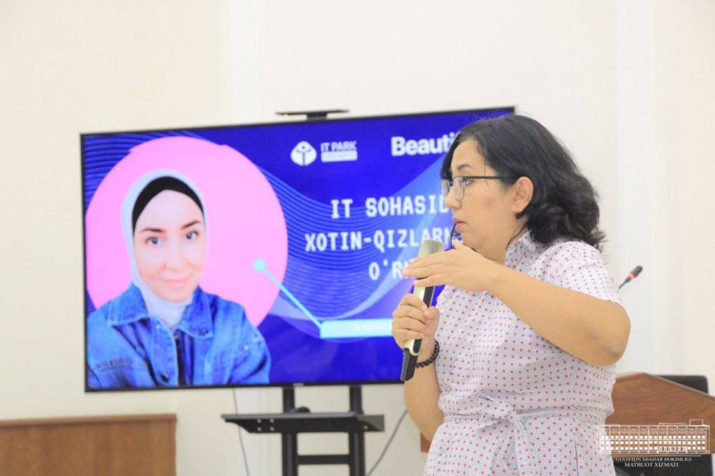Бугунги кунда мамлакатимизда ахборот технологиялари йўналишида 9 мингдан ортиқ хотин-қизлар меҳнат фаолиятини олиб бормоқда. Сўнгги уч йилда Республика миқёсида дастурчи хотин-қизлар учун қатор лойиҳалар маҳаллий ва хорижий танловлар, минглаб иштирокчиларга янги лойиҳаларни амалга ошириш учун молиявий кўмак берилмоқда. Хотин-қизларни IT соҳасига қизиқтириш, тарғибот ишларини олиб бориш мақсадида Гулистон шаҳрининг “Ёшлар маркази” мажлислар залида “Beautify”стартап лойиҳаси асосчилари Нигора Оқилова ва Наргиза Қосимова иштирокида “IT соҳасида хотин-қизларнинг ўрни” мавзусида семинар-тренинг ўтказилди. Семинарда туман ва шаҳарлардан келган хотин-қизлар фаоллари қатнашди.